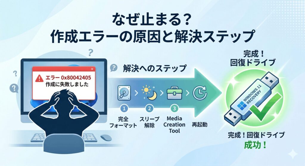 作成が順調に進んでいたのに、あと少しというところで「この回復ドライブを作成中に問題が発生しました」と出て、エラーコード 0x80042405 が表示される。これ、本当によくある現象で、めちゃくちゃ萎えますよね。