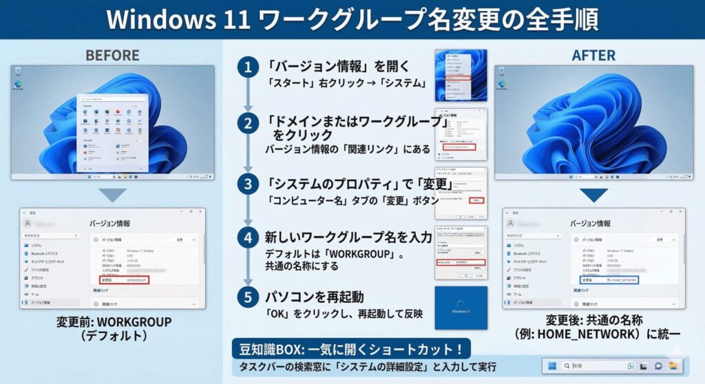 - ワークグループ名の確認と変更の具体的な手順