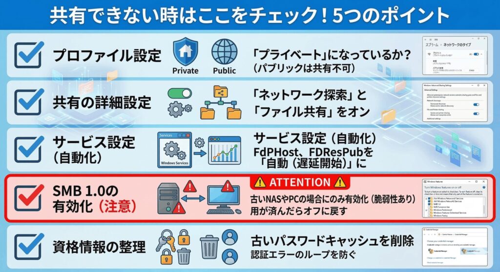 土台の設定ができたら、次は実際に共有を運用する上でのテクニックや、よくあるトラブルの解決策を深掘りしていきましょう。特に「設定したはずなのに動かない」という時のチェックリストとして役立ててください。