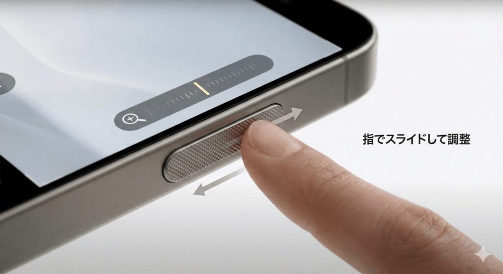 項目を選んだら、次はボタンの表面を左右(または上下)に「スライド」させてみましょう。指を滑らせるだけで、レンズのズーム倍率をシームレスに変えたり、写真の明るさを調整したりできます。