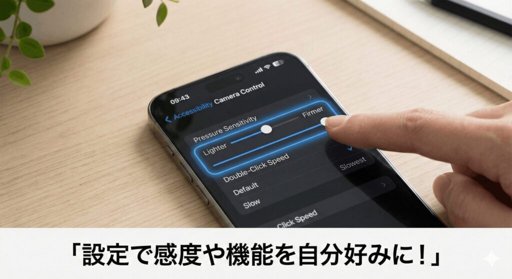 人によって指の力や感覚は違いますよね。「設定」アプリから「アクセシビリティ」を開き、カメラコントロールの項目をチェックしてみてください。