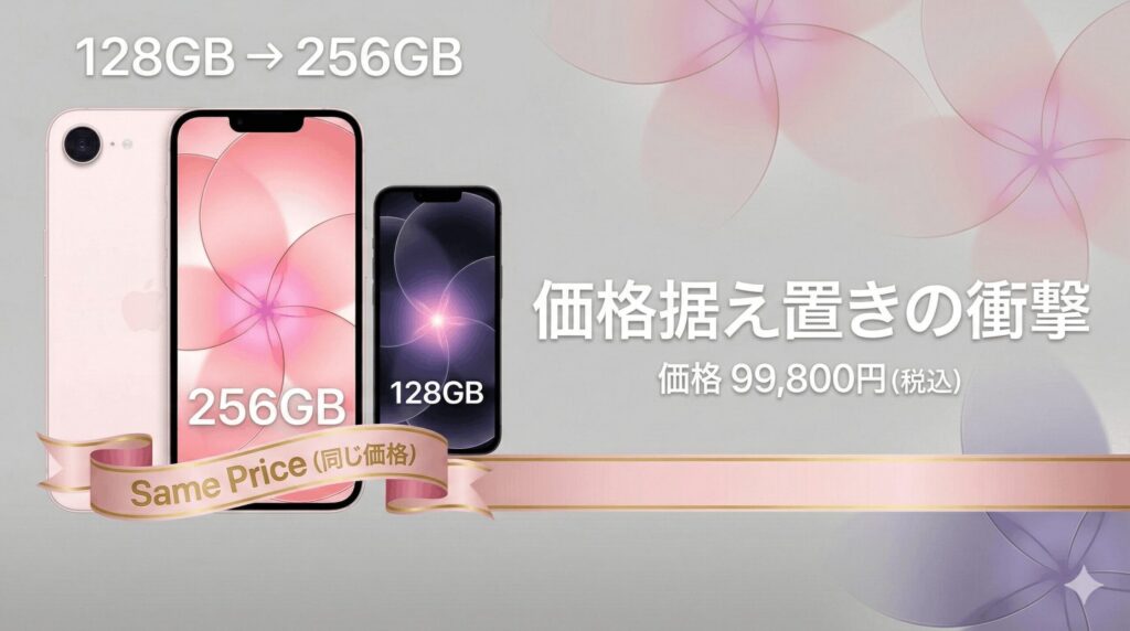 これが今回の目玉と言っても過言ではありません。iPhone 16eの128GBモデルが99,800円だったのに対し、iPhone 17eは最小容量が256GBに倍増した上で、同じ99,800円という価格設定なんです。つまり、実質的な大幅値下げが断行されたということになります。写真や動画のデータ量が増え続けている今、128GBでは足りなくなるケースが多いので、この判断は本当にありがたいですよね。
