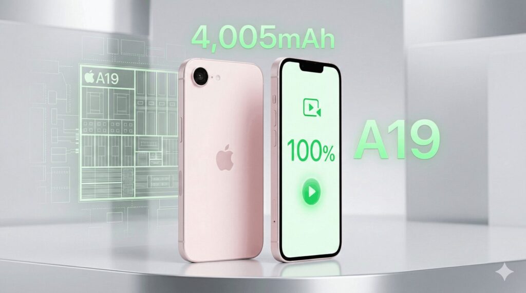 iPhone 17eの心臓部には、最新のA19チップが搭載されています。3nmプロセスで製造されたこのチップは、高性能なだけでなく消費電力が極めて低いのが特徴です。