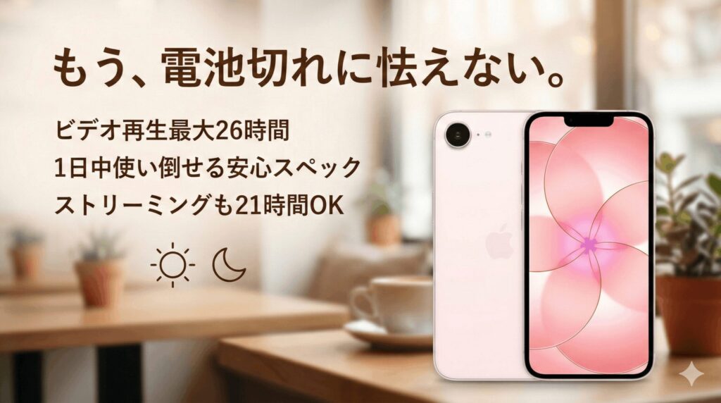 iPhone 17eは、最大26時間のビデオ再生が可能になっています。これ、動画視聴が多いあなたにとってはかなり心強い数字じゃないでしょうか。ストリーミング再生でも最大21時間持つので、出先でYouTubeや映画を長時間楽しんでも安心です。