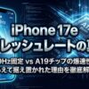 iPhone SE(第3世代)と比較すると、まさに別次元の進化ですよね。物理容量では勝る17eですが、ビデオ再生時間でiPhone 17に一歩譲るのは、ディスプレイの省電力性能の差が影響しているようです。120Hz駆動との兼ね合いについては、iPhone 17の120hzとバッテリー設定ガイドも参考にしてみてください。