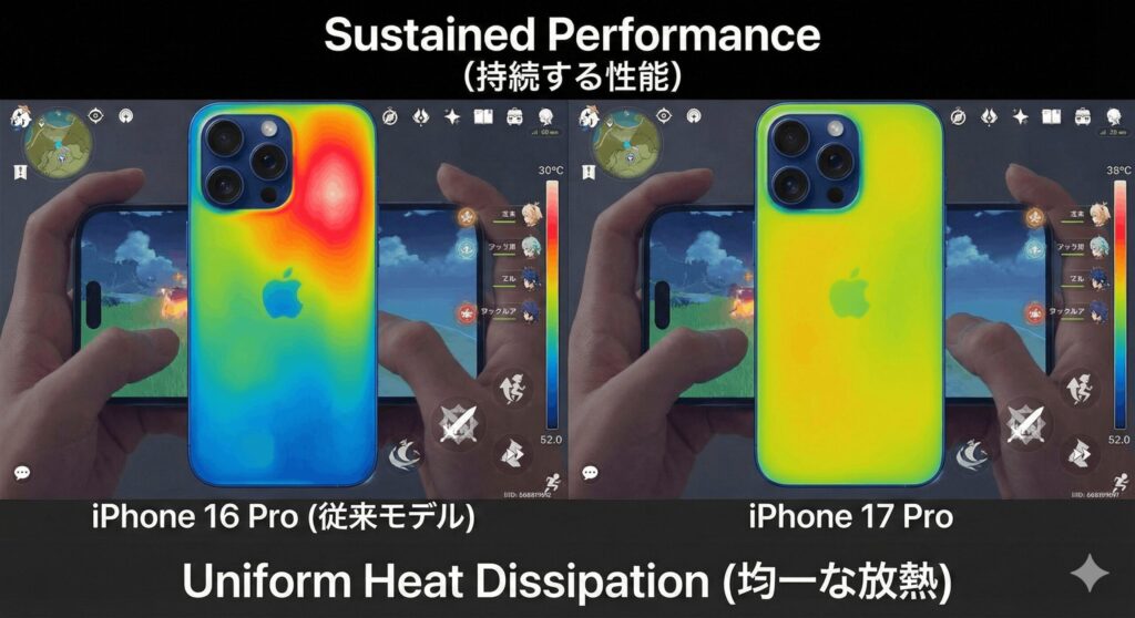 従来のiPhoneは「カメラの横だけがめちゃくちゃ熱い!」という、熱の偏りがありました。しかし、ベーパーチャンバーを搭載したiPhone 17 Proは、熱を筐体全体に均一に広げるのが得意です。