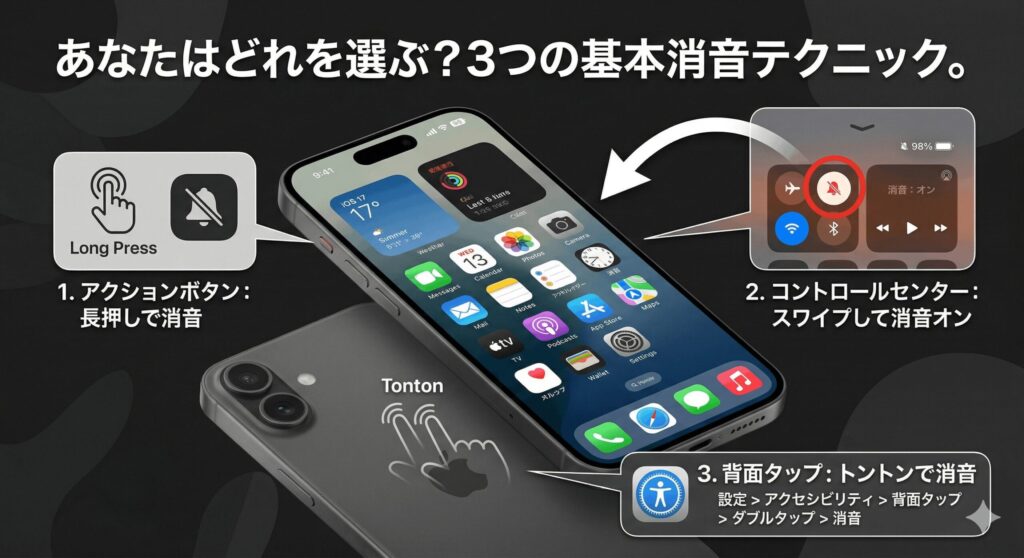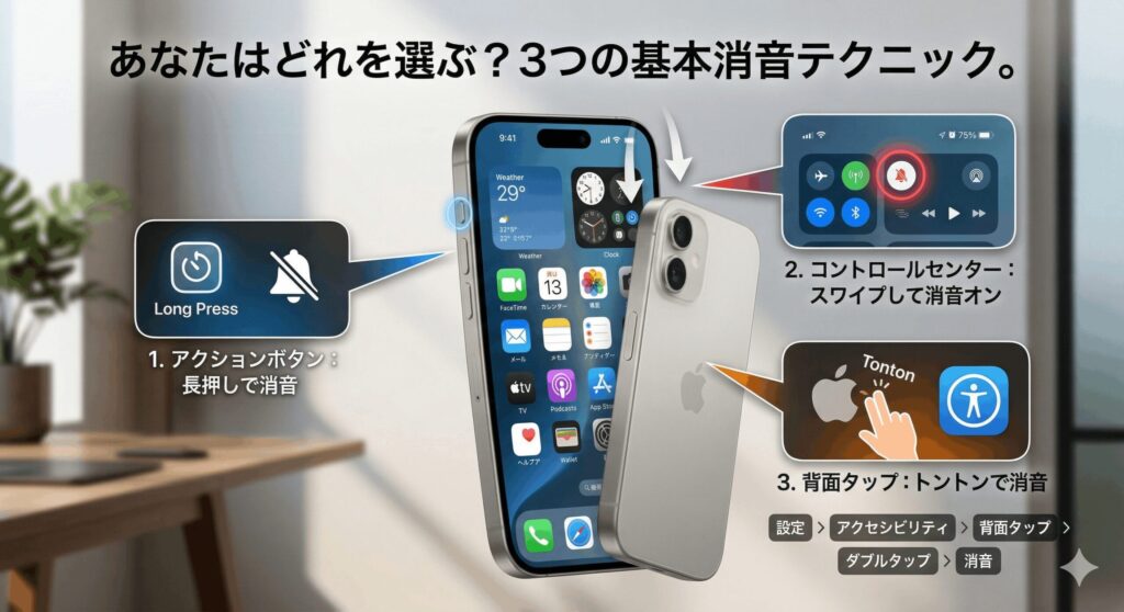 1. 物理スイッチ廃止後のアクションボタンを活用した基本の消音手順