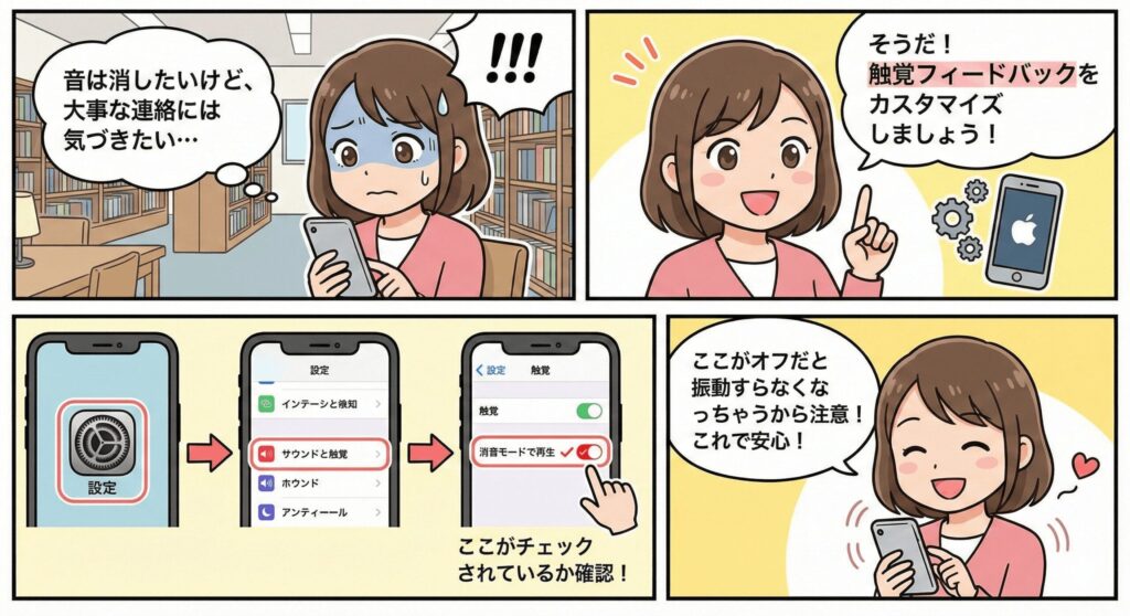 「音は消したいけど、大事な連絡には気づきたい」という時は、触覚フィードバックをカスタマイズしましょう。「設定」>「サウンドと触覚」>「触覚」の項目で、「消音モードで再生」にチェックが入っているか確認してください。ここがオフになっていると、消音モード時に振動すらなくなってしまうので注意が必要です。自分専用の振動リズムを作ることもできるので、特定の相手からの連絡を振動だけで判別する、なんて高度な使い方もおすすめですよ。