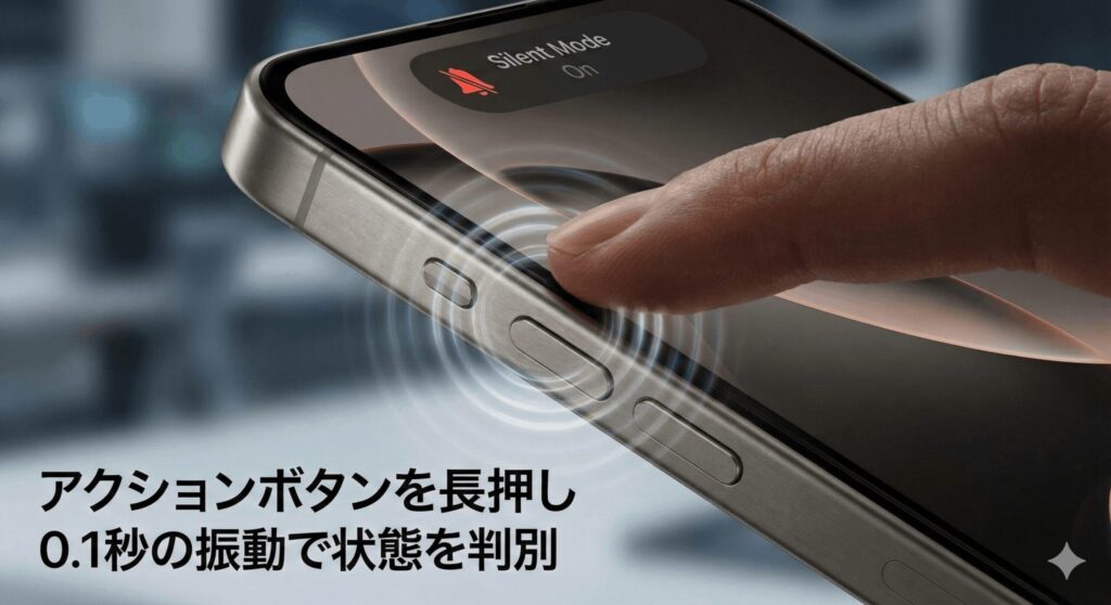 iPhone 17では、本体左側の音量ボタンの上にある「アクションボタン」が消音制御の主役です。従来のスイッチのようにカチッと動かすのではなく、ボタンを約1秒間長押しすることで消音モードのオンとオフを切り替えます。短く押しただけでは、画面に「長押しして消音」という案内が出るだけで、勝手にモードが変わることはありません。これは、バッグの中で何かに当たった際の誤作動を防ぐための、Appleらしい賢い設計ですね。