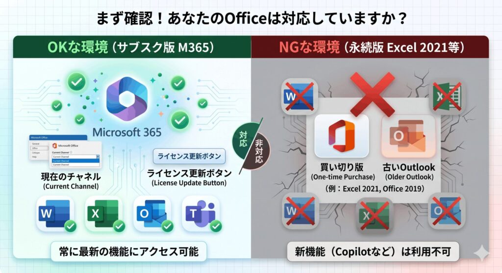 Microsoft 365 copilot 有効化に向けて一番最初につまずきやすいのが、このライセンスの仕組みですね。AI機能はベースとなるMicrosoft 365プランの「アドオン(追加機能)」として提供されているため、専用のライセンスが追加で付与されていないと絶対に利用できません。法人向けと個人向けでデータの保護基準が違うため、プランが厳密に分かれています。買い切り版のOffice(2019や2021など)ではクラウドベースのAI機能が技術的にサポートされていないので、サブスクリプション契約が必須かなと思います。