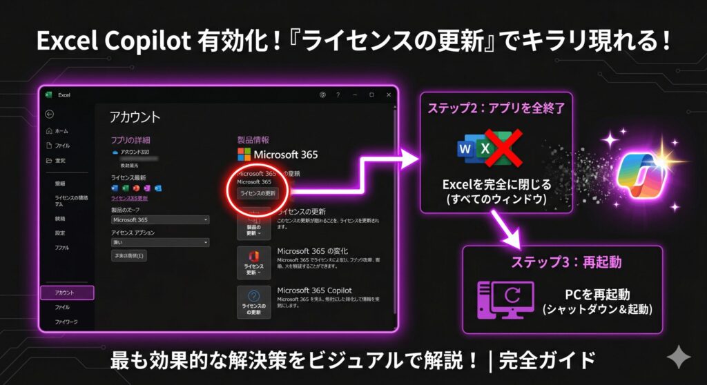 更新ボタンを押した後は、開いているファイルをすべて保存して閉じ、アプリ自体を完全に再起動してください。これによって古いトークンが破棄され、AI権限が含まれた最新のトークンが取得されます。ただし、これはあくまで「管理者が正しくライセンスを付与していること」が大前提です。これでもダメなら、そもそも自分に権限があるのか情シス部門に確認してみるのが確実かなと思います。