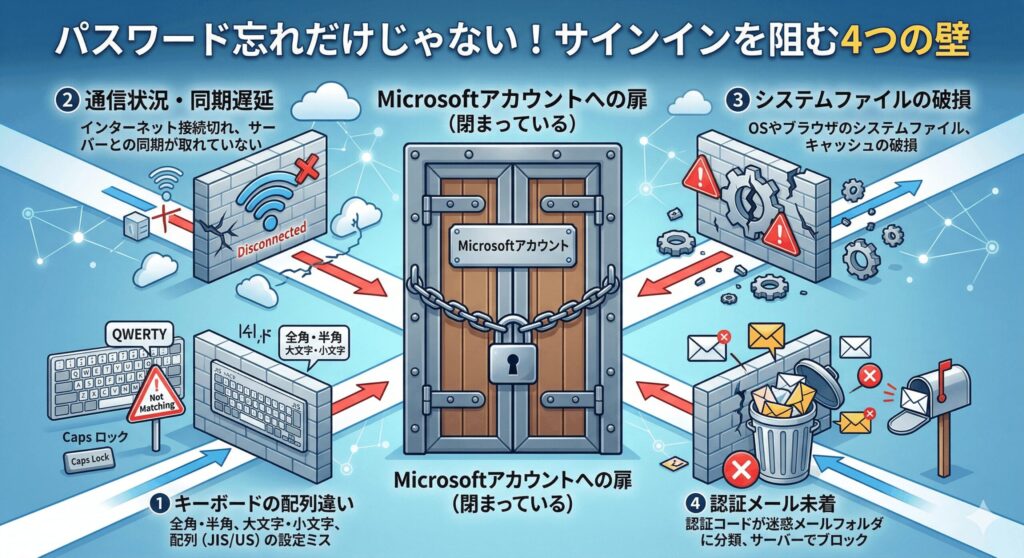 パスワードが通らない、あるいは変更手続きがうまくいかないとき、実はパスワードそのものの間違い以外に原因があるケースが非常に多いんです。まずは、自分の環境で何が起きているのか、物理的な部分からシステムの内側までチェックしてみましょう。