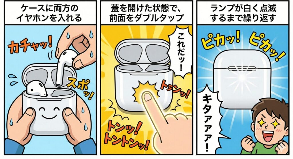 ボタンがないAirPods 4などの最新モデルを白く点滅させるには、まずケースの蓋を開けます。その状態で、ケース前面のランプ付近を2回素早くタップしてください。これで白点滅が始まります。もし工場出荷状態に戻したいなら、「ダブルタップを3回繰り返す(特定のタイミングで)」という特殊な操作が必要です。物理ボタンがないからこそ、この「タップのコツ」を掴むのが一番の近道ですね。