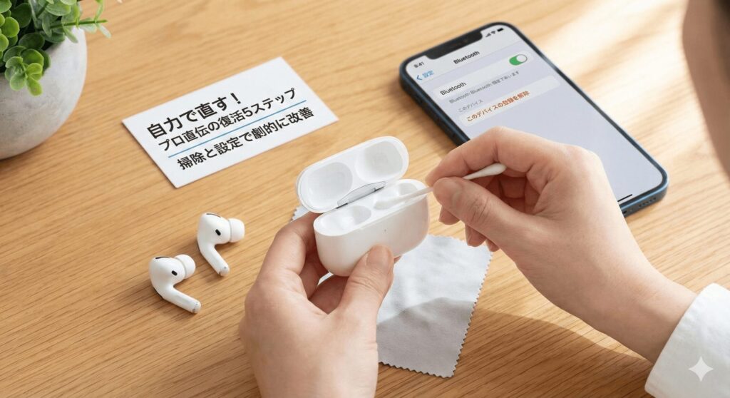 基本的なことですが、ケース自体のバッテリーが空だとBluetoothモジュールが起動せず、白点滅しません。また、クリーニングも重要です。綿棒に少しだけ無水エタノールを含ませ、ケース底のピンを優しく掃除してみてください。「カチッ」と奥までイヤホンがはまる感覚があれば、認識が回復してリセットできるようになる可能性が高いです。