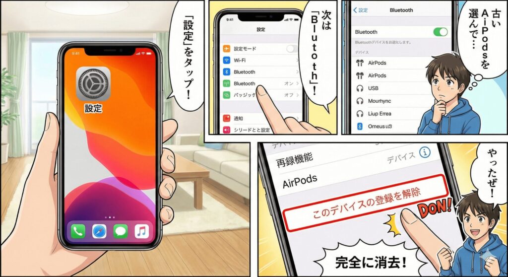 ハードウェア側の操作をする前に、iPhone側の設定も綺麗にしておきましょう。「設定」>「Bluetooth」から、古いAirPodsの登録を「このデバイスの登録を解除」で完全に消去してください。