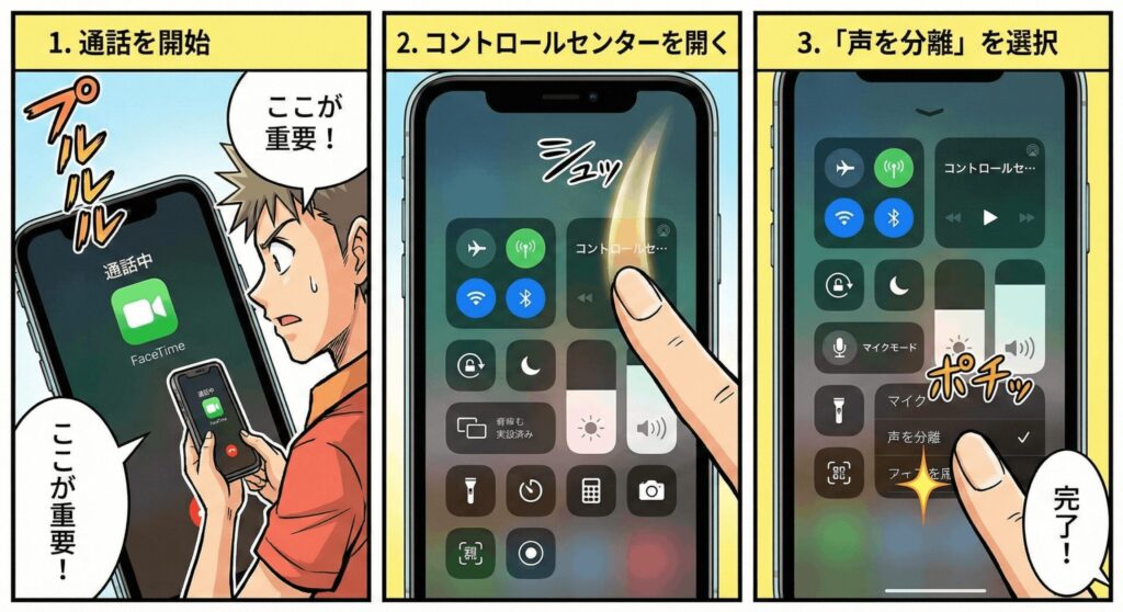 まず真っ先に試してほしいのが、iOSの「声を分離(Voice Isolation)」機能のオンです。これを使うだけで、工事の音や街の喧騒の中にいても、あなたの声だけを魔法のように抽出して相手に届けてくれます。