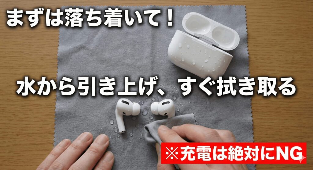 万が一AirPods Proを水に落としてしまった場合、その直後の数分間の行動が運命を分けます。精密機器であるAirPods Proにとって、水分は天敵です。ここでは、ダメージを最小限に抑えるためのテクニカルな初動対応について解説しますね。