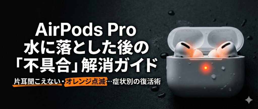 こんにちは、パソガジェなびのkeitoです。愛用しているAirPods Proを水に落とした瞬間って、本当に頭が真っ白になりますよね。数万円もする高価なデバイスですし、もし洗濯機で洗ってしまったり、トイレに落としたりしたらショックで立ち直れないかもしれません。片耳だけ聞こえない状態になったり、ケースがオレンジ点滅を繰り返したりすると、もう高い修理代を払って買い換えるしかないのかなと不安になるはずです。でも、諦めるのはまだ早いですよ。この記事では、AirPods Proを水に落としたときに復活の可能性を最大限に高めるための正しい応急処置や、その後の対処法について詳しくお伝えします。大切なデバイスを救うために、まずは落ち着いて読み進めてみてくださいね。