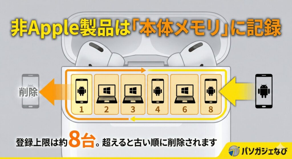 非Appleデバイスにおいて、AirPodsは一般的なBluetoothイヤホンとして動作します。この場合、iCloud同期は働かず、AirPods本体内のメモリにペアリング情報を保存することになります。