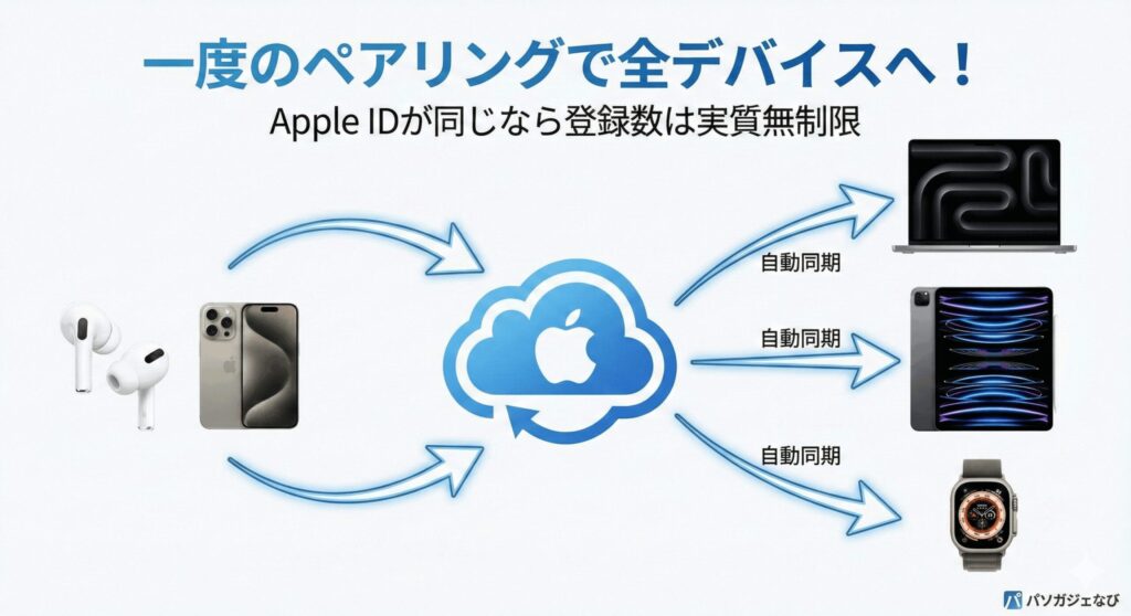結論から言うと、iPhoneやiPad、MacなどのApple製品を使っている場合、AirPodsの登録台数に具体的な制限はありません。これは、AirPodsのペアリング情報がBluetoothチップの中だけでなく、iCloudキーチェーンを通じてあなたのApple IDに紐付いているすべてのデバイスに自動で共有されるからです。