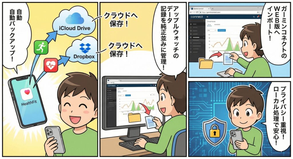 HealthFitを使えば、iPhone内にデータを保存するだけでなく、iCloud DriveやDropboxなどのクラウドストレージに自動でバックアップを取ることもできます。ガーミンコネクトのWEB版からこのファイルをインポートすれば、アップルウォッチの記録をガーミン純正データとほぼ同じ精度で管理できるようになります。プライバシーを重視して、外部サーバーを通さずローカルで処理したい人にもぴったりなツールかなと思います。