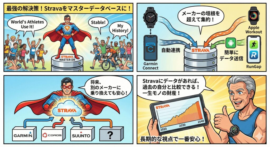 ガーミンコネクトからは公式機能で自動連携できますし、アップルウォッチからも標準のワークアウトアプリや、先ほど紹介したRunGapを経由して簡単にデータを飛ばせます。こうすることで、将来もしガーミンから別のメーカー(例えばCOROSやSUUNTOなど)に乗り換えたとしても、Stravaにさえデータがあれば、過去の自分との比較がいつでもできるようになります。長期的な視点で見ると、これが一番安心できる運用方法ですね。