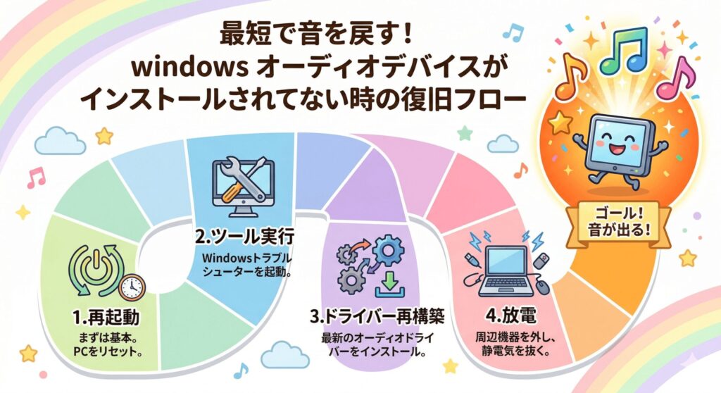 これにより、メモリ上のエラー情報がクリアされ、OSが起動時にハードウェアをゼロから探し直す「再列挙」というプロセスが走ります。このプロセスによって、見失っていたオーディオチップが「あ、ここにいたんだ!」とOSに再発見されるパターンが非常に多いんです。まずは手軽なここから試すのが、私の一番のおすすめですよ。まずはリフレッシュさせてみましょう。