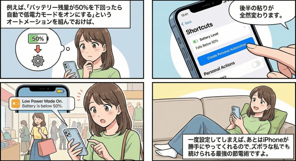 例えば、「バッテリー残量が50%を下回ったら自動で低電力モードをオンにする」というオートメーションを組んでおけば、後半の粘りが全然変わります。一度設定してしまえば、あとはiPhoneが勝手にやってくれるので、ズボラな私でも続けられる最強の節電術ですよ。