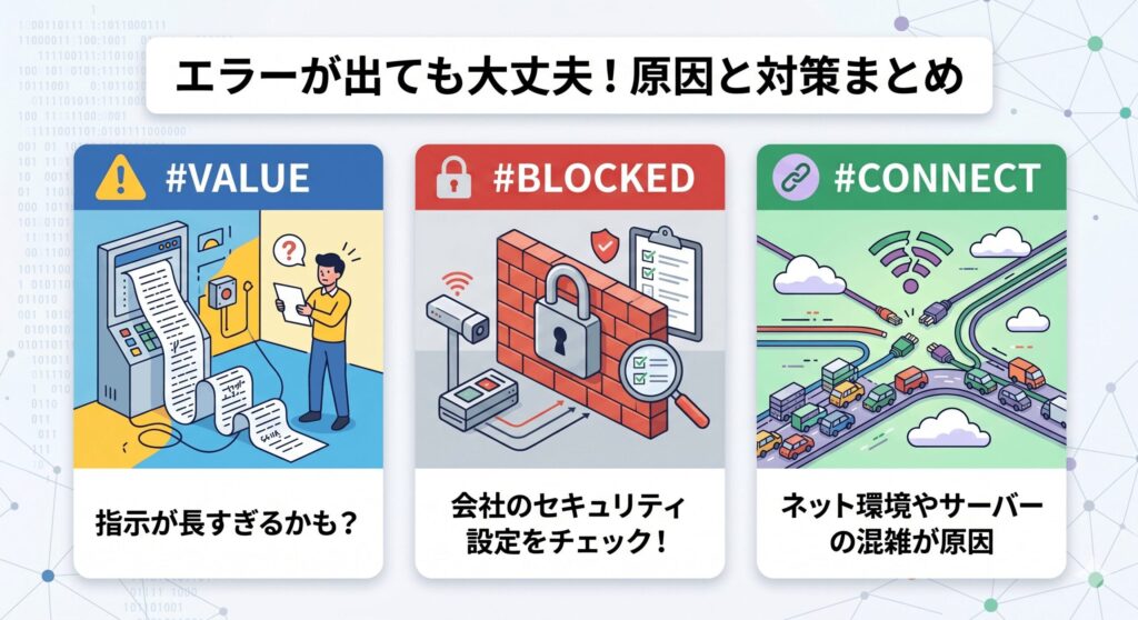 実際にセル内でインラインのAI関数を使っていると、見慣れないエラーに遭遇することがあります。例えば「#VALUE」というエラーが出た場合、入力した指示文(プロンプト)が長すぎてAIの処理上限を超えているか、書き方がAIにとって理解不能な状態になっています。この場合は、AIが迷わないように指示を短く、もっと具体的に書き直すのがベストですね。人間相手にお願いする時のように、分かりやすく伝えるのがコツです。