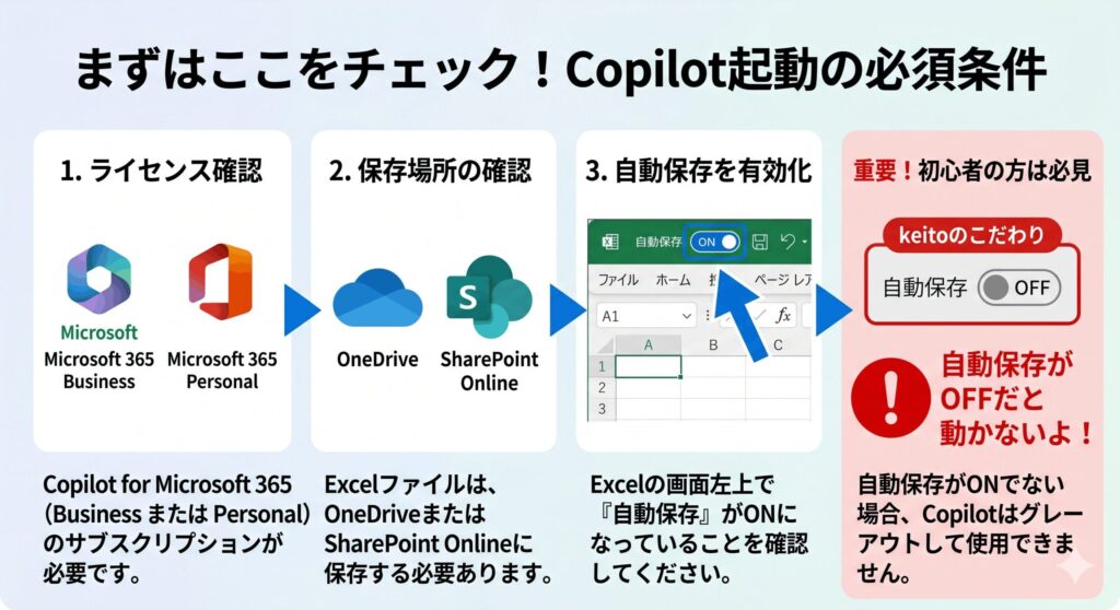 次に、最も見落としがちなのがファイルの保存場所です。デスクトップなどのローカル環境にだけ保存されているファイルは、AIが読み込むことができません。必ず「OneDrive」または「SharePoint」にファイルを保存し、Excelの左上にある「自動保存」のスイッチをオンにしておく必要があります。これは、AIがクラウド上のデータストリームをリアルタイムで解析する仕組みになっているからなんですよ。
