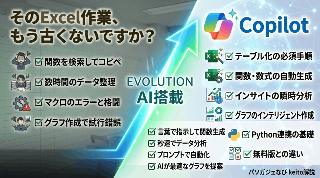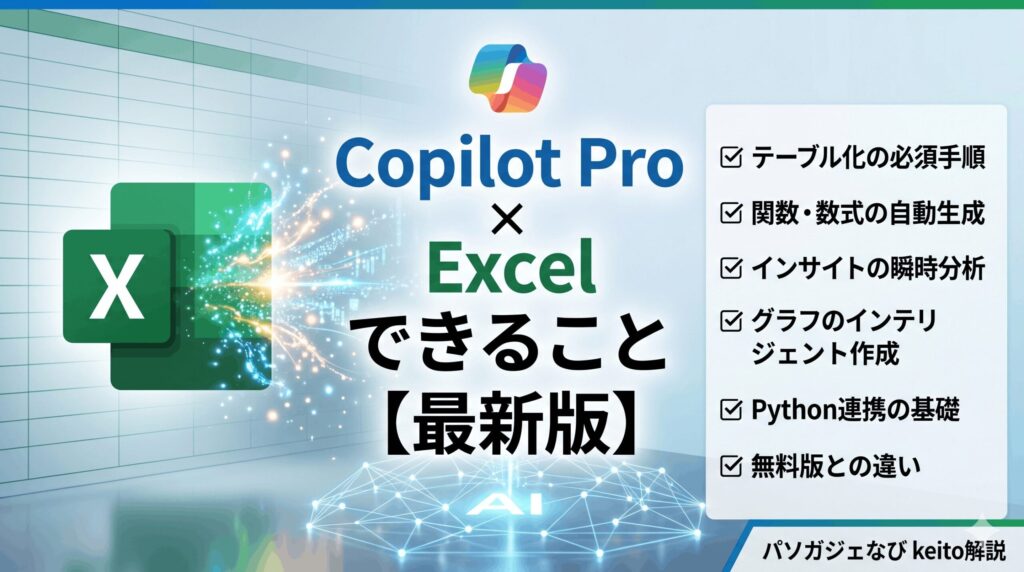 こんにちは、パソガジェなびのkeitoです。最近、AIを仕事にどう活かすかって話、本当によく耳にしますよね。中でもExcelにAIが搭載された「Copilot」は、数字を扱う私たちにとって最も気になる存在じゃないでしょうか。でも、いざ使おうと思っても「Copilot pro Excel できること」って具体的に何なの?とか、どうやって始めるのが正解なの?と疑問に思うことも多いかなと思います。