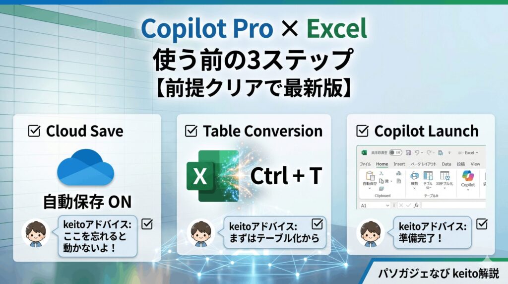 テーブル化されていないデータに対しては、Copilotの機能は一切利用できません。また、ファイルがOneDriveまたはSharePointに保存されており、「自動保存」がオンになっていることも必須条件です。ローカル保存のままでは動かないので注意してくださいね。