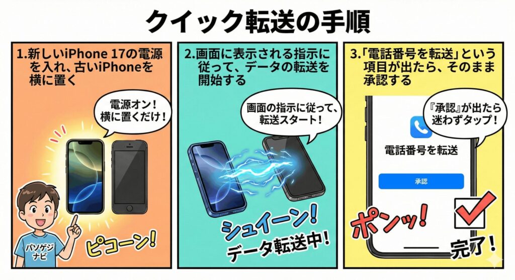 これまで使っていたiPhoneからiPhone 17へ機種変更する場合、「eSIMクイック転送」を使うのが一番簡単です。この機能を使えば、古いiPhoneを新しいiPhone 17に近づけるだけで、電話番号の情報をワイヤレスで移すことができちゃいます。