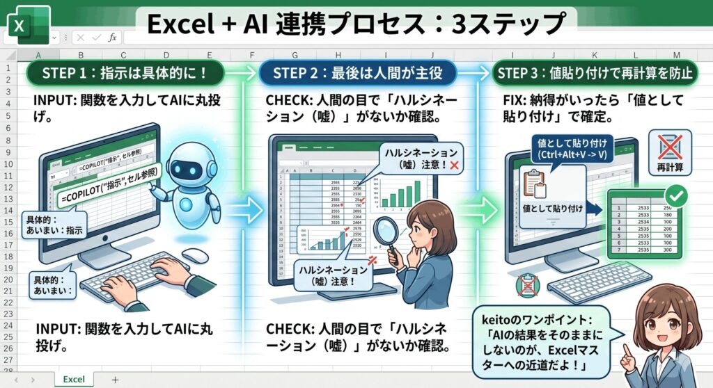 最後に、excel copilot関数を使う上でもっとも大切にしてほしい心得をお話ししますね。それは、AIの出した答えを鵜呑みにせず、必ず「人間の目」でダブルチェックすることです。AIは非常に優秀ですが、時として「ハルシネーション(もっともらしい嘘)」をつくことがあります。特に数値の計算や正確な事実関係は、従来の関数の方が得意だったりします。