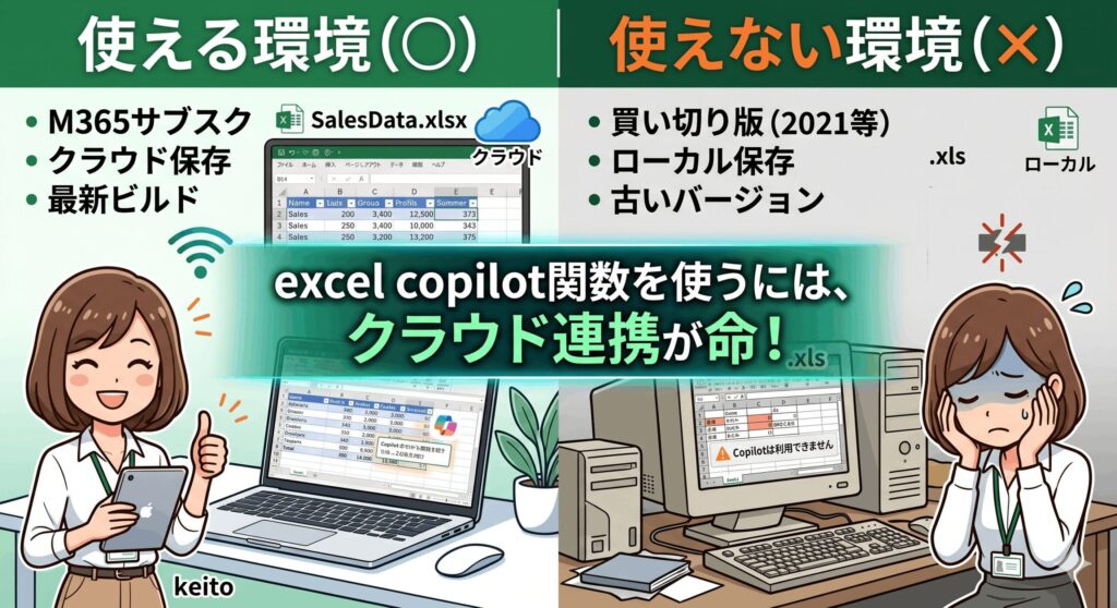 新機能を使い始める前に、まずは土台となる環境チェックからスタートしましょう。Excel Copilotは従来の関数と違って、クラウドやライセンスの条件がかなりシビアなんです。せっかく設定しても「動かない!」とならないように、まずはこのセクションの内容を一つずつ確認してみてくださいね。