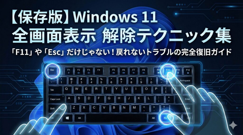 Windows11で作業をしているとき、いきなり画面全体がアプリで埋まってしまって焦ったことはありませんか。タスクバーが消えたり、いつもの閉じるボタンが見えなくなると、PCがフリーズしたみたいで不安になりますよね。実はwindows11の全画面表示を解除する方法はいくつかあって、キーボードのショートカットキーやマウス操作でサクッと解決できるんです。F11キーやEscキーが効かない場合の対処法や、タスクバーが自動で隠れてしまった時の設定についても詳しく解説しますね。この記事を読めば、もう全画面モードから戻れなくて困ることはなくなりますよ。