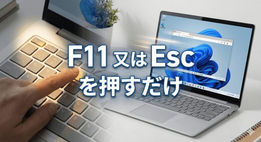 もしF11を押しても反応がない場合は、アクティブなウィンドウ(今操作している画面)がブラウザになっているか確認してくださいね。デスクトップをクリックした状態だと反応しないことがあります。ちなみに、この操作はWindows標準の機能なので、多くのフォルダ(エクスプローラー)などでも共通して使えます。