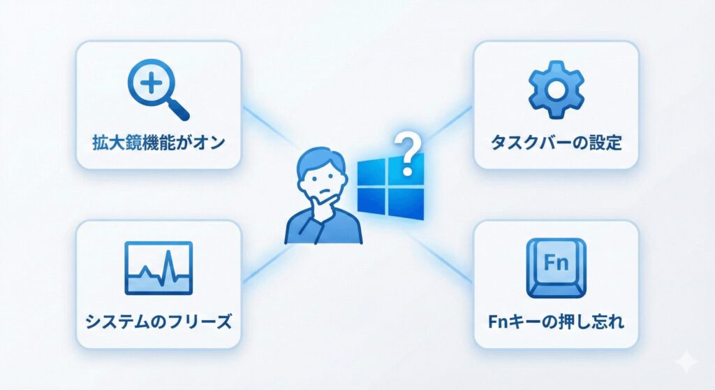 基本的な方法を試しても画面が戻らない場合、それは単なる全画面モードではなく、システム上の不具合や別の機能が動いている可能性があります。ここからは、少し踏み込んだトラブルシューティングを解説します。PCが壊れたわけではないので、一つずつ確認していきましょう。
