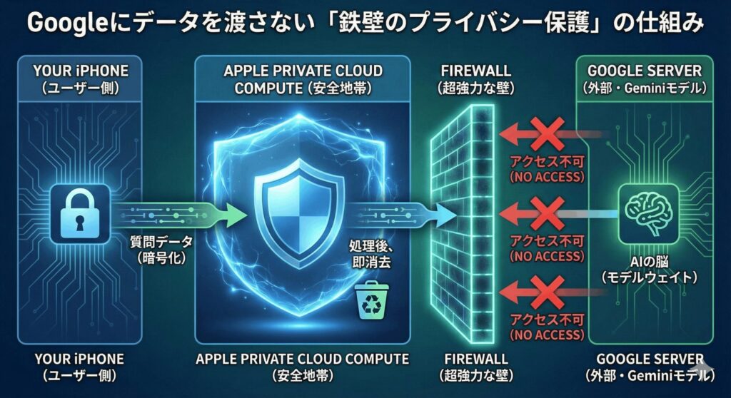 これだけ便利な機能がクラウドで処理されるとなると、やっぱり気になるのはプライバシーですよね。でも、そこはプライバシーを社是とするApple。Googleと手を組みつつも、私たちのデータを守るための鉄壁の布陣を敷いています。