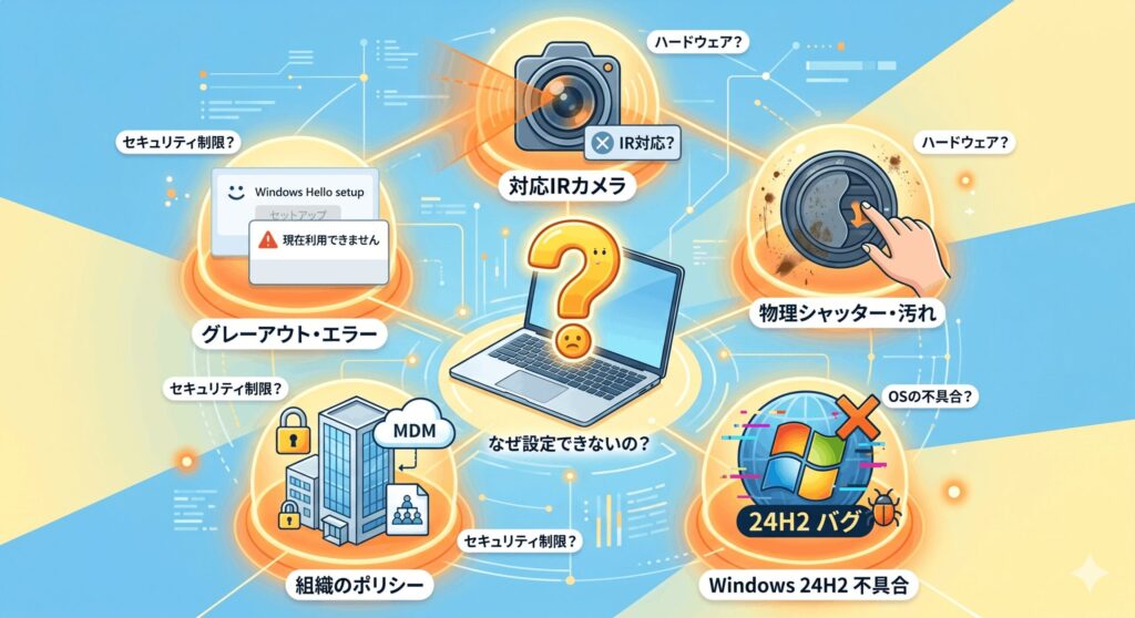 まずは、なぜあなたのPCで顔認証のセットアップが進まないのか、その根本的な「正体」を突き止めましょう。ハードの物理的な問題から、OSのバージョンによる相性まで、考えられる主な原因を深掘りしていきますね。