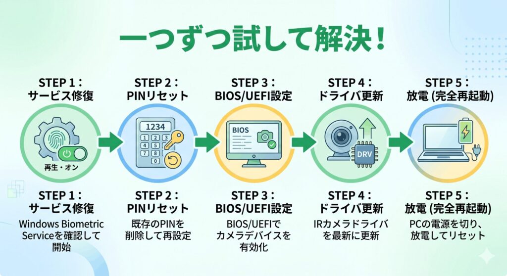 それでもダメな場合は、生体認証のデータベースを保存している「NGCフォルダ」という領域が壊れている可能性があります。このフォルダ内の情報をクリアして、PINから登録し直すことで、システムの整合性が取れて顔認証が復活します。論理的な不整合が起きているときは、一度「更地」にしてから作り直すのが、結局は一番の近道になるんですよね。