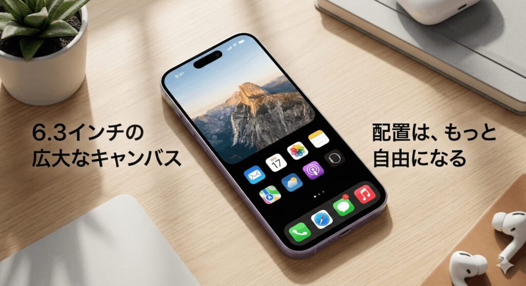 まずはカスタマイズの土台となる基本的な部分から見ていきましょう。iPhone 17シリーズは、スタンダードモデルでも画面サイズが6.3インチにアップし、ベゼルが極限まで細くなったことで、ホーム画面というキャンバスがぐっと広くなりました。この広さをどう活かすかが、センスの見せ所ですよ。