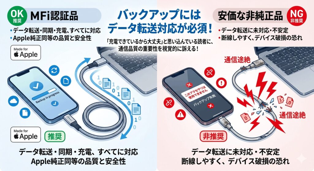 ケーブル一本で結果が変わるなんて、意外に思うかもしれません。でも、バックアップは非常に繊細なデータのやり取りなので、物理的な足回りを固めるのが一番の近道なんです。もし予備のケーブルがあれば、別のケーブルで試してみるのも良い切り分けになりますよ。接続が安定すれば、バックアップの速度もグッと上がります。具体的な互換性については、ケーブルメーカーやAppleの公式サイトで最新の仕様を確認するようにしてくださいね。