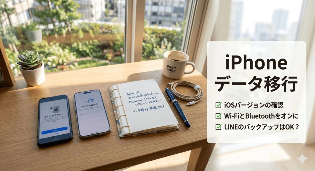 移行作業の途中で、必ずと言っていいほどApple IDの認証を求められます。普段Face IDやTouch IDで済ませていると、パスワードを度忘れしてしまうことってありますよね。作業が始まってから焦らなくて済むように、Apple IDとパスワードは事前にメモしておくか、パスワード管理ツールで確認しておきましょう。また、2ファクタ認証用のコードが受け取れる信頼できるデバイスも手元にあると安心です。