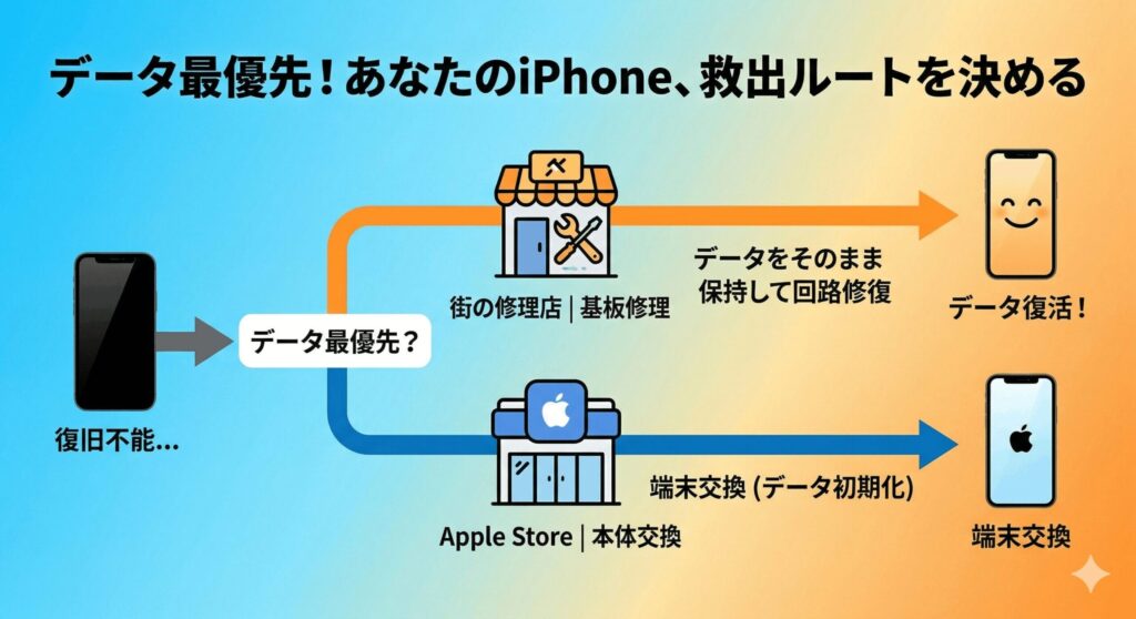 街の修理店に持っていって画面のパーツを交換しても直らない場合、iPhoneの頭脳である「メイン基板(ロジックボード)」自体が壊れてしまっている深刻な状態です。水没や強烈な落下衝撃が原因のことが多いですね。正規店に持っていくと確実に「修理不能で本体交換(データはパー)」と言われてしまう絶望的な状況です。