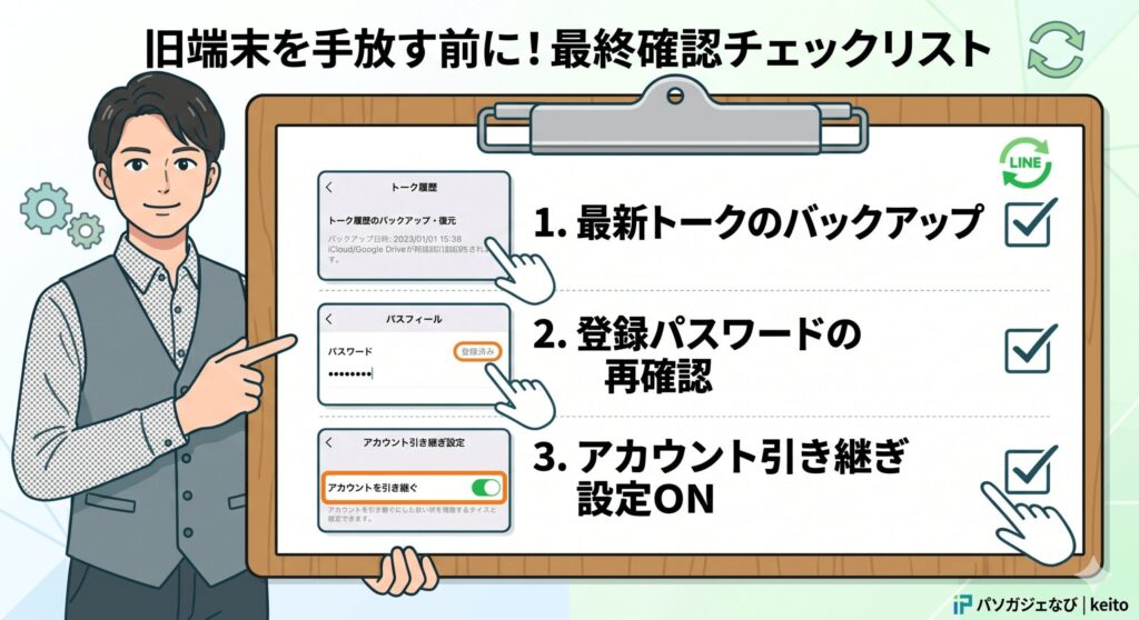 結論として、クイックスタートはiPhoneを丸ごと移してくれますが、LINEの中身に関しては「事前のバックアップ」と「新端末での手動ログイン」が不可欠です。逆に言えば、バックアップさえしっかり取ってあり、パスワードを把握していれば、クイックスタート後の移行作業は5分もかからずに終わります。焦らず、まずは古い端末が手元にあるうちに準備を完璧に整えましょう。