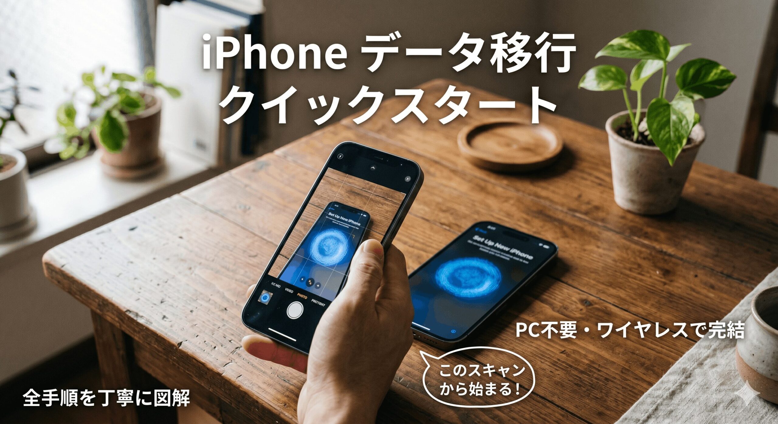 クイックスタートは、新旧のiPhoneを近づけることで直接データを転送するApple公式の機能です。Wi-Fi 6やBluetooth、あるいは有線ケーブルを介して、写真や壁紙、アプリの配置、Wi-Fi設定まで丸ごとコピーしてくれます。基本的には「古いiPhoneの環境をそのまま再現する」ものですが、LINEのような高いセキュリティが求められるアプリは、アプリ本体はコピーされても、「中のアカウント情報」までは完全にはコピーされません。
