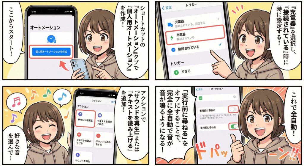 iPhoneを充電器に繋いだとき、いつもと同じ「ポーン」という音。悪くはないけれど、ちょっと味気ないと感じませんか。このiphoneショートカットレシピのすごい遊び心は、充電開始のタイミングをトリガーにして、好きなキャラクターの声や楽曲を再生させられる点にあります。これ、通称「充電音カスタム」と呼ばれていて、SNSでも非常に人気がある面白い活用法なんですよ。