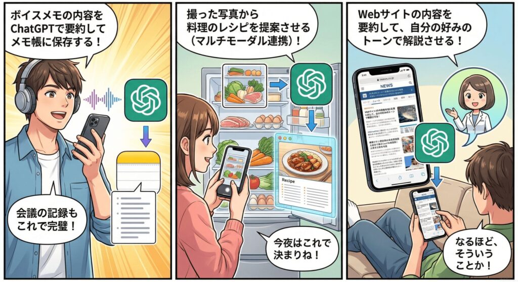 設定は意外と簡単で、ChatGPTの公式アプリが提供している「ショートカットアクション」を利用します。私がおすすめするのは、iPhone 15 Pro以降に搭載された「アクションボタン」にこのショートカットを割り当てる方法です。ボタンを長押しするだけで音声入力が始まり、あなたの質問がChatGPTに送られ、その回答が即座に読み上げられます。「今日の夕飯の献立を冷蔵庫にあるもので考えて」とか「この英文をビジネス風に書き換えて」といった複雑な依頼も、iPhoneを操作することなく声だけで完結します。これ、SF映画の世界が手元に来たみたいでワクワクしませんか。