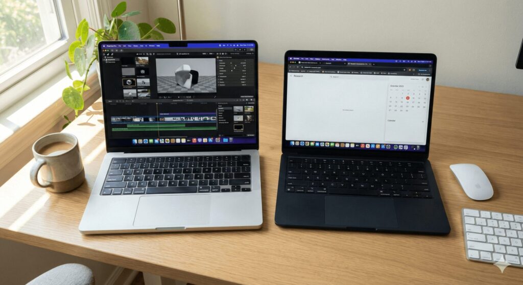 私の見解では、M5 MacBook Airは長時間の重い作業には向きません。熱がこもるとサーマルスロットリングが発生し、せっかくの性能が制限されてしまうからです。短時間のAI処理なら爆速ですが、動画編集などで1時間を超えるような負荷をかけるなら、冷却ファンのあるProモデルか、安定感のあるM4 Airの方が賢明な選択かもしれません。